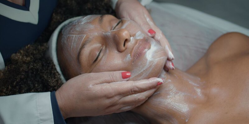 Gentle Cleansing: A creamy cleanser is gently massaged onto your skin, focusing on stress areas to relax and prepare your skin for the treatment.